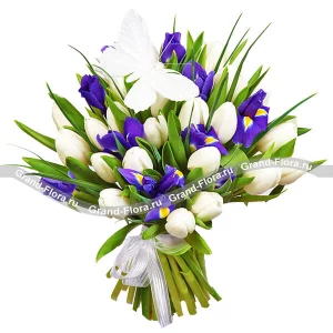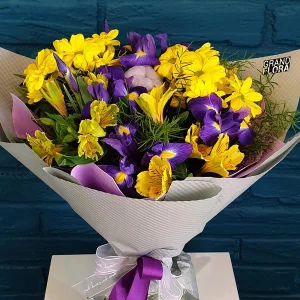 Лучезарность – букет с ирисами, альстромериями и хризантемой