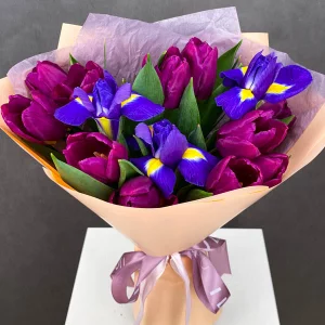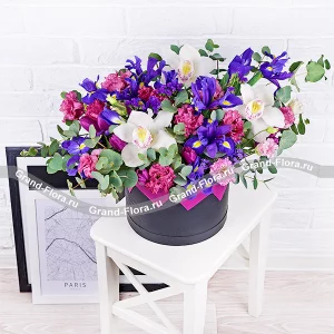 Звездное небо - коробка с ирисами и фиолетовыми тюльпанами