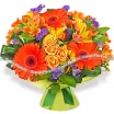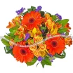 Уменьшенный: гербера оранжевая - 2 шт, роза кустовая оранжевая - 1 шт, альстромерия оранжевая - 2 шт, статица фиолетовая - 1 шт, рускус,фетр зеленый.
