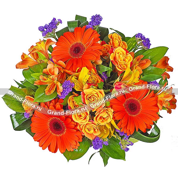Композиция составлена из ярких оранжевых альстромерий, гербер и роз с непринужденным добавлением фиолетовой статицы.