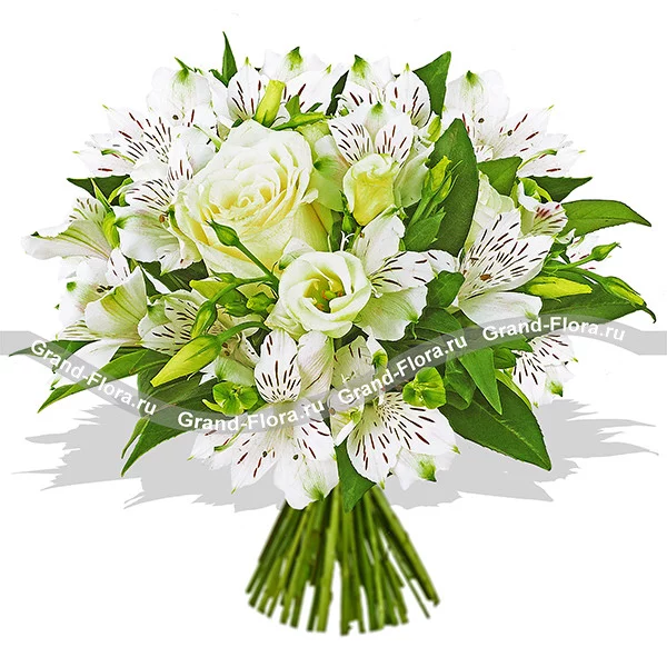 Стандартный (на фото): роза белая - 3 шт., альстромерия белая - 5 шт., эустома белая - 5 шт., салал, сетка зеленая. Примерный объем букета 30см.