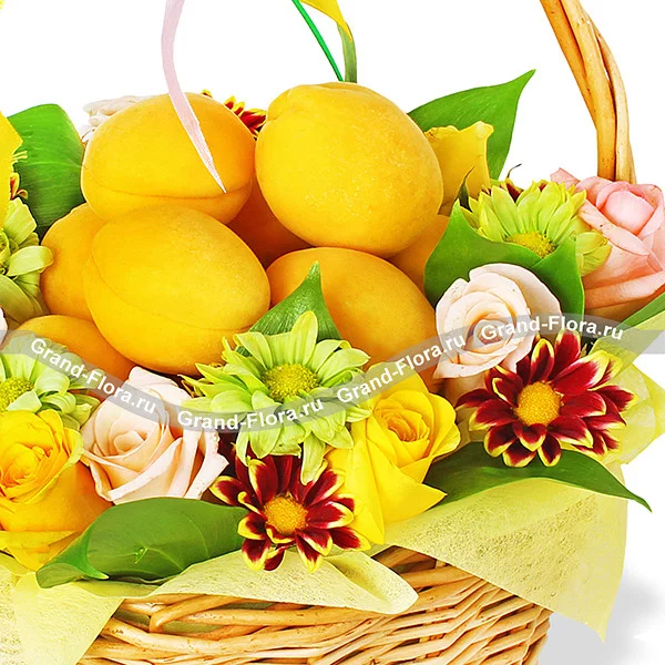 роза розовая (маленький бутон) - 4 шт., роза желтая (маленький бутон) - 5 шт., хризантема мелкоцветная зеленая - 1 шт., хризантема бордовая - 1 шт., рускус - 2 шт., фетр желтый, оазис, корзина малая, бант желто - зеленый, абрикос - 1 кг.