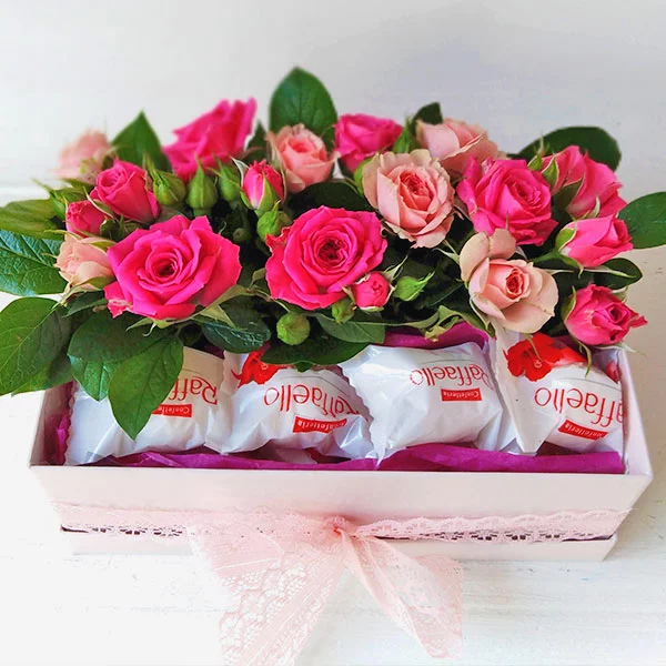 Стандартный: роза кустовая розовая - 5 шт., роза кустовая белая - 2 шт., макаруны (возможна замена на зефир), декор, оазис, коробка средняя.