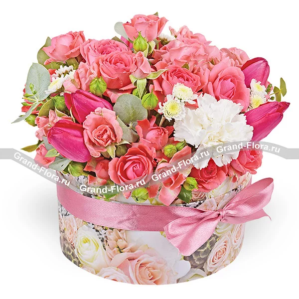 Стандартный: тюльпаны розовые - 4 шт., кустовая роза розовая - 5 шт., гвоздика белая - 1 шт., хризантема сантини - 1 шт., эвкалипт, оазис, коробка малая, лента.