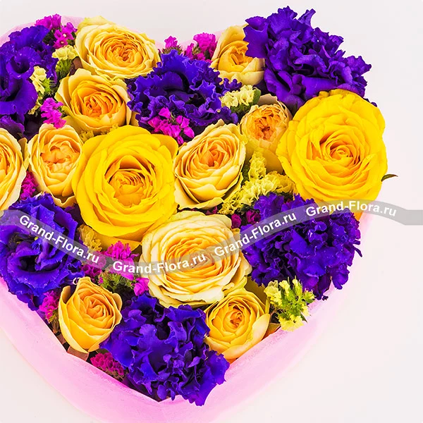 Мой Купидон - сердце с кустовыми розами и эустомой
