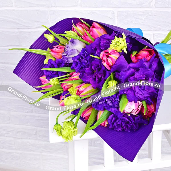 Стандартный: тюльпан розовый - 15 шт., эустома синяя - 8 шт., лента. Размер: 25Х40 см.