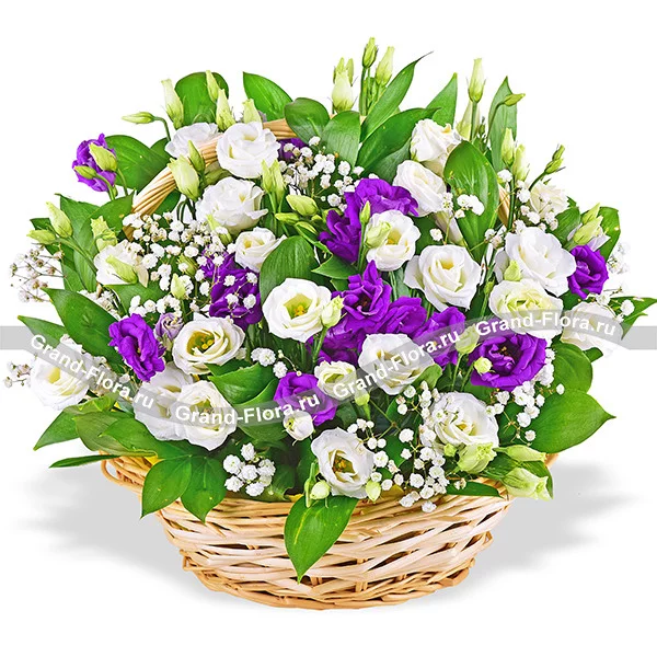 Нежное сочетание белых и сиреневых эустом выигрышно подчеркивает гипсофила и декоративная зелень. Букет, помещенный в изящную корзину, станет безупречным решением для вручения дорогому человеку на праздник.